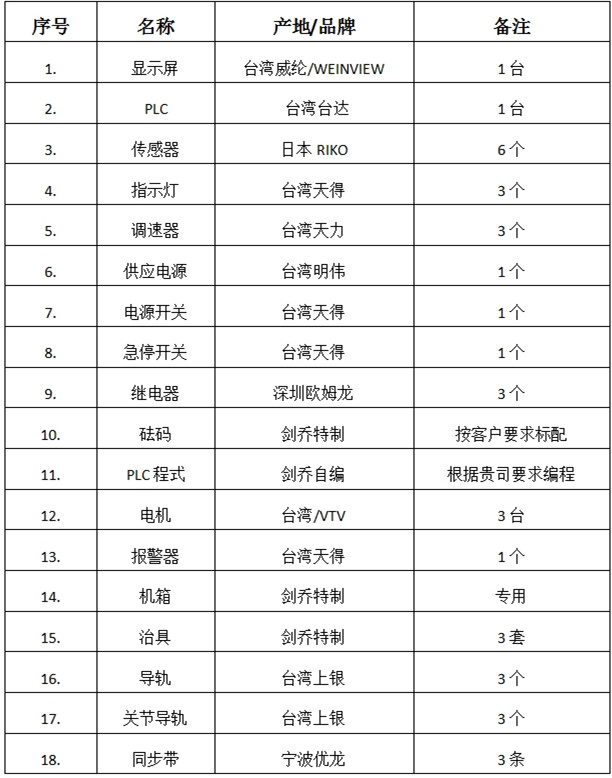 產(chǎn)品型號:JQ-887 品牌:劍 喬 用途:一、本機概述; 本機機械結(jié)構(gòu):采用臺灣變頻調(diào)速電機凸輪結(jié)構(gòu)配合日本THK精密線性滑軌完成線性上下動作,電器控制部分:采用臺灣威倫觸摸屏+臺灣臺達(dá)控制器(PLC).可對計算機、手