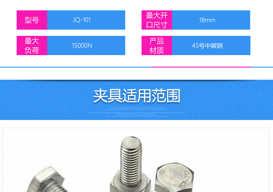 產(chǎn)品型號(hào):JQ-101 品牌:劍 喬 用途:螺栓拉伸夾具適用范圍:螺釘螺栓等材料的拉力,破壞力測(cè)試。
