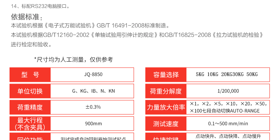 產(chǎn)品型號(hào):JQ-8850 品牌:劍 喬 用途:本系列機(jī)廣泛用于各類(lèi)薄膜、五金、橡膠料、紡織、建材、絕緣體、電線、電纜、端子等各類(lèi)材料。測(cè)試其拉伸、撕裂、穿刺、剝離、抗壓、彎曲、抗剪切、定荷重、定位移、三點(diǎn)抗折
