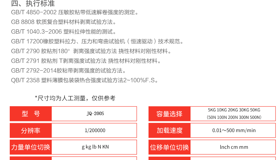 產(chǎn)品型號:JQ-200S 品牌:劍 喬 用途:本機是一款專業(yè)適用于膠粘劑、膠粘帶、不干膠、醫(yī)用貼劑、保護(hù)膜、離型紙、復(fù)合膜、人造革、編織袋、薄膜、紙張等相關(guān)產(chǎn)品的剝離、拉斷等性能測試的電子剝離試驗機,其最大試